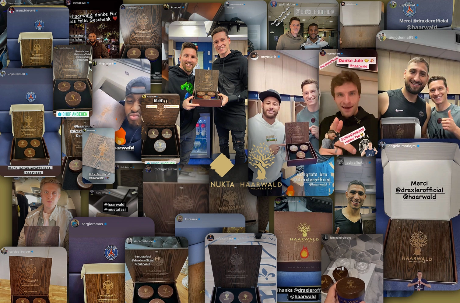 Worldfootballer Lionel Messi, brazilian superstar Neymar Jr, worldchampion Kimpembe, PSG-Stars; Sergio Ramos, Achraf Hakimi, Angel di Maria // Thomas Mueller, Wijnaldum, Marco Reus, Leandro Lopes the list goes on. Haarwald supports them all on and off the field.
